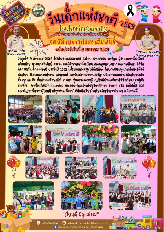 วันศุกร์ที่ 9 มกราคม 2569 โรงเรียนวัดเนินเขาดินคณะครูและบุคลากรทางการศึกษา ได้จัดกิจกรรมวันเด็กแห่งชาติ เพื่อมอบความสุขให้แก่เด็กๆ ตั้งแต่ระดับชั้นอนุบาลถึงชั้นประถมศึกษาปีที่ 6 โรงเรียนวัดเนินเขาดินขอขอบพระคุณสำหรับทุนการศึกษา อาหาร ขนม เครื่องดื่ม และของขวัญของรางวัลทุกชิ้นจากผู้ใหญ่ใจดีทุกท่านที่มอบให้กับนักเรียนโรงเรียนวัดเนินเขาดินมา ณ โอกาสนี้ |