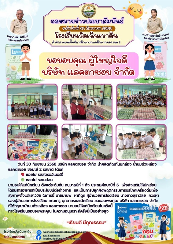 วันที่ 30 กันยายน 2568 บริษัทแลคตาซอยจำกัด ได้นำผลิตภัณฑ์นมแลคตาซอย ซอยโย่ รสสตอเบอรี่และรสเมล่อนมามอบให้แก่นักเรียน ตั้งแต่ระดับชั้นอนุบาล 1-ชั้นประถมศึกษาปีที่ 6