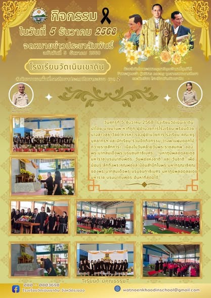 วันศุกร์ ที่ 5 ธันวาคม 2568 โรงเรียนวัดเนินเขาดินพร้อมด้วยคณะครูและนักเรียน ร่วมจัดกิจกรรมวางพานพุ่มดอกไม้ถวายสักการะ เนื่องในวันคล้ายวันพระราชสมภพของพระบาทสมเด็จพระบรมชนกาธิเบศรมหาภูมิพลอดุลยเดชมหาราชบรมนาถบพิตรและวันพ่อแห่งชาติ เพื่อน้อมรำลึกถึงพระมหากรุณาธิคุณอันหาที่สุดมิได้ |